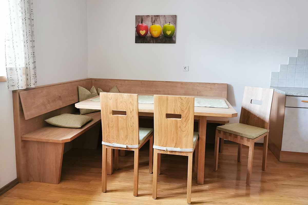 Einzigartig an dieser Wohnung ist die urige Bauernstube. Die alte Täfelung aus Zirbenholz und der traditionelle Kachelofen verleihen diesem alten Wohnzimmer einen Hauch von Gemütlichkeit und Geborgenheit und ermöglichen Ihnen in ein Stück gelebter Geschichte einzutauchen.