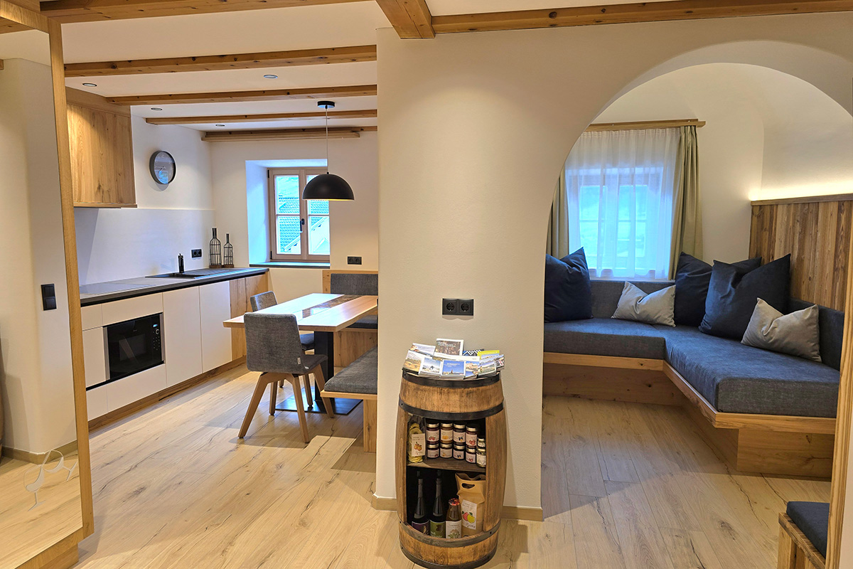 Auf Sie warten eine großzügige Wohnküche, ein gemütlicher Essbereich mit Eckbank und eine angenehme Liegelounge unter historischem Kuppelgewölbe. Vorhanden sind Kühlschrank mit mehreren Gefrierfächern, Geschirrspüle, Elektroherd, komfortable Mikrowelle, Kaffeemaschine, Wasserkocher, ausreichend Geschirr und noch viel mehr. Das Badezimmer verfügt neben Dusche auch über einer Badewanne und einer Waschmaschine. Die Wohnung besteht aus zwei getrennten Schlafzimmern, beide mit Doppelbett und einem Zusatzbett mit Matratze. Einzigartig an diesem Apartment ist das Schlafzimmer mit uriger Holzdecke und Täfelung aus Altholz – das Herz eines Bauernhauses – ein Raum mit Geschichte(n).
